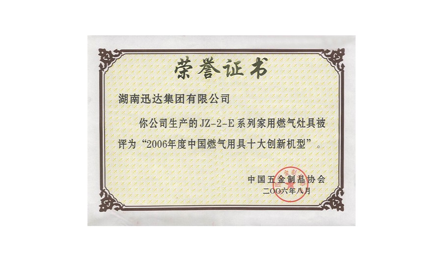 迅达JZ-2-E系列家用燃气灶具被评为“2006年度中国燃气用具十大创新机型”。
